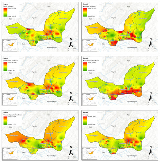 For Sarajevo, Bosnia and Herzegovina, the average urban community resilience index was 0.4533. In regard to the resilience index of different types of communities, mountain slope courtyard community was the highest (0.5263). It was followed by urban apartment community (0.4843) and suburban community (0.4419). The lowest was found in urban scattered communities (0.3831). Comprehensively compared, the resilience values of different dimensions are ranked as follows: community capital resilience (0.5564) > social resilience (0.5131) > institutional resilience (0.4195) > infrastructural resilience (0.3930) > economic resilience (0.3843).
