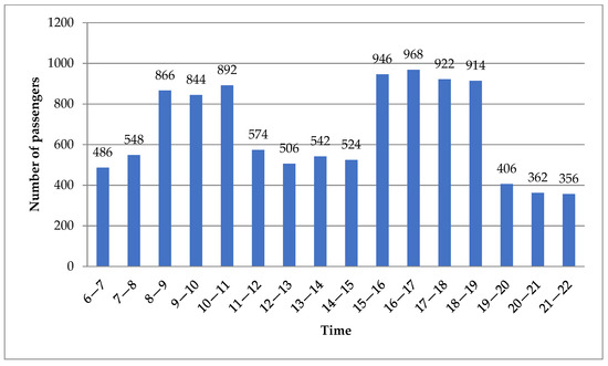 To illustrate the effectiveness of the proposed optimal model, the Tianjin Airport shuttle bus system was used as an example for analysis. On 7 and 8 May 2022, a total of mobile phone data points were gathered to detect 30 demand points and 45 alternative bus stations. After data processing, the total flow of passengers per hour during the daily operating hours was obtained. Furthermore, a time-varying travel time/distance travel matrix between demand points, bus stations, and depots, including 1350 pairs of walking distances and another 2601 pairs of travel distances and times, was extracted from Baidu Map APIs. Although the hourly traffic volume and travel time are not the same, their evolution pattern shows alternating high and low peaks due to the tidal phenomenon of residents’ travel. In general, the whole day can be divided into five different periods, including two peak periods (8:00–11:00 and 15:00–19:00) and three flat periods (6:00–8:00, 11:00–15:00, and 19:00–22:00). Their average passenger flows and travel times in each period can be used to approximate the value of the corresponding hour. Figure 4 and Figure 5 show the time-varying passenger flow and travel time during five different periods, respectively. Table 3 shows the number of passengers at each demand point during five different periods. Hence, the ASBN design result of five periods can be equivalent to those of all different hours in this case.