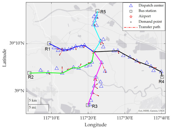 Figure 7 shows a map-based bus route plan, and passenger guidance map, where the red star indicates the airport, the blue square indicates a dispatch center, the blue triangle indicates a bus station, and the black dot indicates a demand point. The dark blue solid line denotes R1, the solid green line represents R2, the solid pink line denotes R3, the solid black line denotes R4, and the light blue solid line denotes R5. Except for the ASBN route plan, the transfer paths of passengers are shown by the red dashed lines from the chosen blue triangles to black dots.