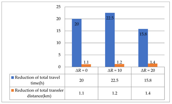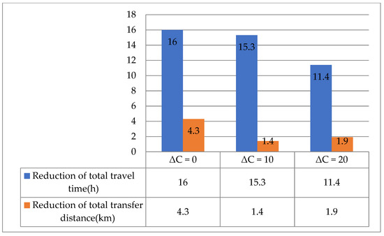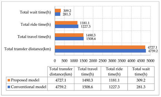 In addition, Figure 9, Figure 10 and Figure 11 illustrate the difference in model performances of the conventional and proposed models under different scenarios. The total travel time and transfer distance of the proposed model were reduced compared to the conventional model under all scenarios. The differences in model performance are consistent with the patterns in Figure 8, further verifying the proposed model’s feasibility.