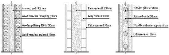 From the early Stone Age to when the semi-crypt house sites were created, small temporary camps used plant material such as canvas for wall-like maintenance structures. Branches and grasses were overlapped to form a ventilated and cool environment in the summer, while in the winter, animal skins were used to keep warm. There was a raised boss at the junction of the canvas and the ground, which is convenient to prevent the penetration of cold wind [16,23]. From the Neolithic Age to the Early Iron Age, in the prevalent semi-crypt house sites, the cave wall and wood-mixed-grass mud roof were the main envelope structures of buildings. The main indoor active surface was below ground level, and the appropriate depth of ground reduction was to avoid cold winds. The effective method was also conducive to the internal heat preservation of the house. In the Balhae Kingdom period (698–926), the walls of large wooden frame ground buildings were mainly made of rammed earth, including wood–bone plate building walls, wood–bone adobe walls, and adobe masonry walls [24]. The thermal insulation performance of rammed earth walls was usually better than that of simple wood–bone mud walls and masonry walls, and it was more conducive to forming a stable and suitable indoor temperature. In the Liao and Jin Dynasties (907–1234), the ground house sites and the walls of large-scale timber-framed buildings were pillar-clad brick walls and blue brick masonry walls, and were compared with civil–timber composite walls. The large-scale application of masonry bricks has reduced the insulation ability of the wall maintenance structure, which has led to the phenomenon of excessive wall thickness. The thickness of the brick wood composite wall is more than 0.6 m [20], while the thickness of blue brick masonry wall in some important architectural sites is even more than 1.3 m [22]. From what we have seen so far in the archaeology of ARB, most of the wall remains are incomplete and mainly belong to three periods, as shown in Table 2.