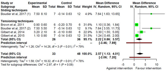 Four studies were included in the meta-analysis comprising five interventions assessing fluid dispersion in intraneural edema artificially induced by the dye spread (Figure 2). Pooled results showed a significant increase in fluid dispersion (MD = 2.57 mm; 95% CI: 1.13 to 4.01) with substantial heterogeneity (I2 = 78%, τ2 = 1.58, p < 0.01). Analyses by type of neurodynamic technique showed increased dye spread in the tensioning techniques group (MD = 2.22 mm; 95% CI: 0.86 to 3.57) with substantial heterogeneity (I2 = 62%, τ2 = 0.38, p = 0.07). Furthermore, sliding techniques appear to have a positive effect on intraneural edema, although the small number of studies did not allow calculation of the pooled MD for these techniques.