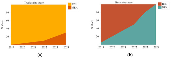 The traffic improvement scenario is a differentiated scenario that adds new energy vehicles (NEA) to the baseline scenario for replacing internal combustion engine vehicles (ICE). From the Panzhihua Yearbook Statistics 2020 [24], it is known that the total stock of buses and trucks in the market in 2019 was 41.417 thousand units, and according to the motor vehicle market turnover in the ten years from 2010 to 2019, an average of 2.4 thousand buses and trucks were traded each year. In the Panzhihua LEAP transport module, the academic life of the vehicle is set at 22 years, a vehicle survival curve is added [31], and the free market for vehicles is interfered with by the policy requirements of the three-year plan. As shown in Figure 10, the market share of ICE and NEA vehicles for trucks and buses and the share of the stock of vehicles using different energy sources change under the traffic optimization scenario in the Panzhihua LEAP transport module. From 2019 to 2024, the proportion of NEA-type vehicles sold in vans and buses gradually increases, reaching a share of 30% and 100%, respectively, by 2024, while the market turnover of ICE-type vehicles for vans decreases to 70% and ICE-type vehicles for buses are no longer sold. As a result of policy interventions in market turnover, the share of the market stock of vehicles using electricity as an energy source is increasing from 2019 to 2024, from 1% to 10%, and the share of the market stock of vehicles using petrol and diesel is decreasing, from 57% and 42% to 52% and 38%, respectively.