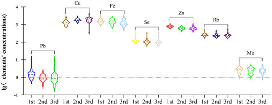 Violin plot of toxic and essential elements, in maternal plasma at 1st, 2nd and 3rd trimester. The plot was established based on the significant difference calculated by the Friedman test (p < 0.05) among plasma elements Pb, Cu, Fe, Se, Zn, Rb and Mo.