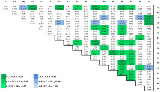 Correlation coefficients (CC, above) and p values (below) for the Spearman correlation between blood trace elements were calculated. The different intensities of correlation are represented by different colors.