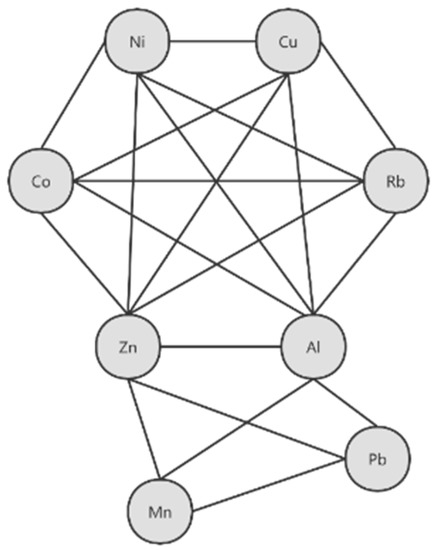 The network was established based on the significant correlations (p < 0.05) among plasma elements Ni, Co, Cu, Al, Rb, Zn, Mn, and Pb.