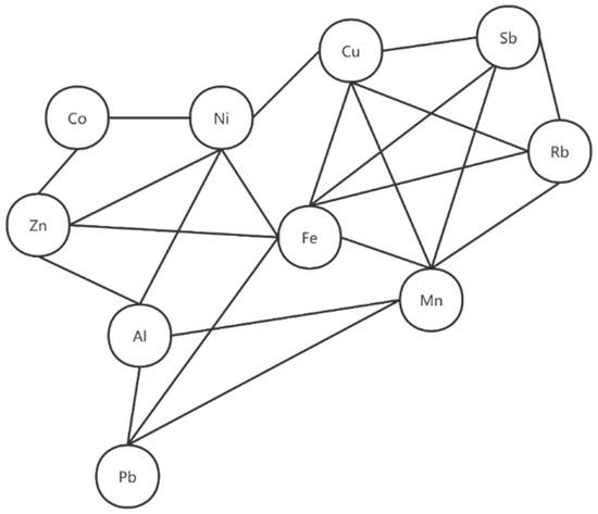 The network was established based on the significant correlations (p < 0.05) among plasma elements Co, Zn, Ni, Al, Pb, Fe, Cu, Mn, Rb, Sb.