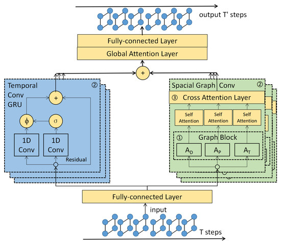 A GNN describes arbitrary graphs using an adjacency matrix so that it has the ability to process non-Euclidean-like data. Numerous studies have integrated GNN with learning-based time series networks to concurrently extract spatial and temporal relationships. Zhao et al. [22] utilized graph convolution to represent spatial dependencies and a GRU to represent temporal dependencies. The STGCN [23] comprises several spatiotemporal convolutional blocks that consist of ChebNet [24] and gated CNN. Additionally, the attention-based STGCN (ASTGCN) [25] was established as a spatial–temporal attention method to dynamically learn the relationships between time and space. In a similar fashion, Guo et al. [26] presented the graph attention-based temporal convolutional network (GATCN), which addresses spatial features via a graph attention network and temporal features with a TCN. Dai et al. [27] presented a spatial–temporal transformer network (STTN) consisting of a GNN and a transformer [28] to dynamically simulate different scales of geographical dependencies and capture long-range temporal connections. Lv et al. [29] used a message passing system and multiple kinds of LSTM to describe spatial–temporal relationships. Li et al. [30] aimed to solve online car-hailing problems with an ST-transformer model and analyzed the spatiotemporal characteristics of online car-hailing data. Shi et al. [31] applied an attention mechanism to a GCN-GRU-based network to capture the importance of different temporal features.