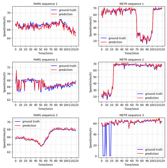 In Figure 3, the actual and predicted speeds obtained for the test subgroups of PeMS and METR are shown. Our model fits the training subsets well and is generally immune to noise. The traffic speed in the first subfigure (row 1, column 1) fluctuates substantially. The anticipated curve nearly matches the real curvature; therefore, our model can handle this situation successfully. In row 2, column 2 of Figure 3, a negligible traffic speed variance is observed. In this instance, which requires the ability to capture sequence information and features that are helpful for prediction, our model also performs well and almost fits the real speed curve. In row 3, column 2 of Figure 3, missing values have been replaced with zeros. Here, our model delivers accurate predictions, illustrating its resistance and robustness to outliers.