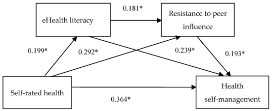 The double chain mediation model of eHealth literacy and resistance to peer influence as mediators of the effect of self-rated health on health self-management. * p < 0.001.