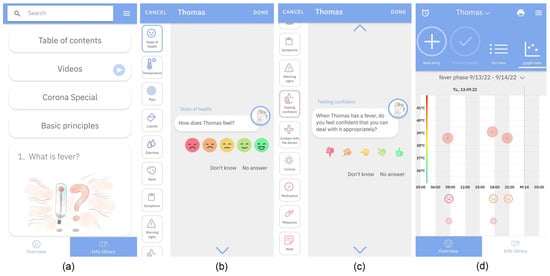 FeverApp view, (a) Info-Library; (b) Documentation-Tool with well-being as an example (c) Documentation-Tool with parental-confidence as an example; (d) Graph view of entries.