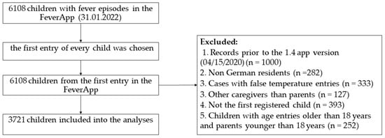 The selected sample corresponded to the first entry of the first episode of one child in each family. To date (31 January 2022), 6108 children were registered in the FeverApp. Records prior to the 1.4 app version (15 April 2020) were filtered because in App-Version 1.3., medication, well-being and symptoms such as warning signs and dehydration were collected separately. In this analysis, only data from German residents were considered. To keep confidence clear and interpretable, caregivers were also filtered and only parents were included in the analyses. To avoid bias from multiple parent data, only the first registered child per parent was included in the analyses. Adult profiles and underage parents were excluded. Finally, 3721 children and their caregivers who entered the first entry of the first episode were analyzed (Figure 2).