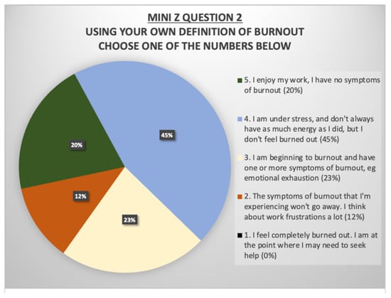 19]. Neither the pre-test nor post-test median scores for either group reached this threshold score of 40. Question 2 of the Mini-Z asks the participant to use their own definition of burnout to choose from five options, and the results can be seen in