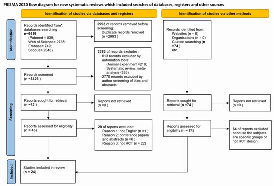 A total of 6419 articles were identified by searching through four databases. After duplicate removal, 3426 items were retained and entered into the title and abstract screening step. At the end of the title and abstract screening step, we obtained 43 articles. Next, 43 full-text articles were independently evaluated for eligibility. According to the exclusion criteria, 29 articles were excluded for several reasons, including a non-English-language study, six conference papers or abstracts, and 22 non-RCT trial designs; 14 articles were retained. We also found 74 other articles after searching the references and citations of the selected studies, from which we retained 10 articles. Finally, we included 24 studies (14 from databases searching and 10 from references and citations search) in the review (Figure 1).