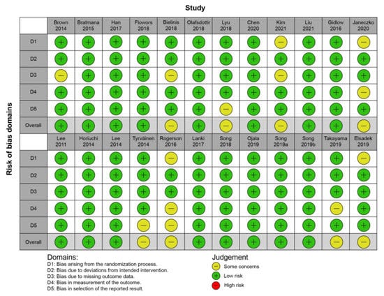 Figure 2 summarizes the results of the risk of bias assessment for the included studies. The majority of the studies had low risk and were acceptable in all five of the following categories: randomization process, deviations from the intended interventions, missing outcome data, measurement of the outcome, and selection of the reported result. Five studies had some risk. Three of them lacked means and standard deviations for the entire collection of outcome variables. The other two studies did not elaborate on the random assignment process and methodologies.