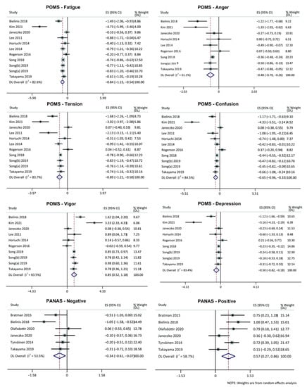 Forest plot of the meta-analysis of the relationship between green space exposure intervention and psychological indicators. Note. This forest plot depicts the meta-analysis results derived from the random effects model. In the case of POMS-Fatigue, the pooled effect size was −0.84, with a 95% confidence interval of −1.15 to −0.54. It shows that the experimental group’s Fatigue score was 0.84 lower than the control group’s and that the difference was statistically significant, p = 0.019 < 0.05 (Table A5). This demonstrates that a short-term green space intervention can reduce fatigue significantly. ES = effect size; I2 = extent of heterogeneity in effect size across studies; CI = confidence interval; POMS: Profile of Mood States; PANAS: Positive and Negative [,,,,,,,,,,,,,].
