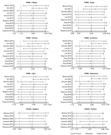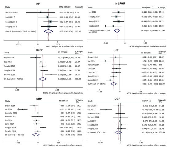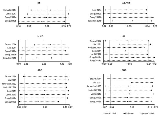 Finally, three studies examined hormone levels, namely those of cortisol [,,]. Overall, the following four outcome variable categories were the most frequently used: BP (SBP, DBP), HRV, POMS scale, and PANAS scale. Hence, given that the review included studies measuring a range of different outcomes, studies measuring these four outcomes were chosen to perform a meta-analysis on particular outcomes.