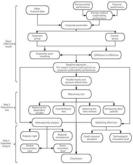 Step 3. Extended research: To further explore the impact mechanism of GCP on CSP, we conduct empirical analyses from the perspectives of heterogeneity and mediating effects. Differences in the internal nature and external environment of enterprises may lead to heterogeneity in the relationship between GCP and CSP. Therefore, we test them in terms of four dimensions: nature of ownership, market concentration, green innovation level and regional characteristics. How does GCP affect CSP? This question is the focus of our research. Commercial banks are the main implementers of GCP, and Chinese enterprises’ sources of debt financing are mostly bank borrowing. The strong version of Porter’s hypothesis suggests that environmental regulations stimulate companies to invest more in technological innovation to gain a first-mover advantage. Therefore, we test whether there are mediating effects in the relationship between GCP and CSP from the perspective of CRA and TIL. Finally, we conclude the paper with meaningful recommendations for companies, government departments and other stakeholders.