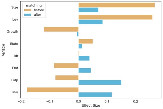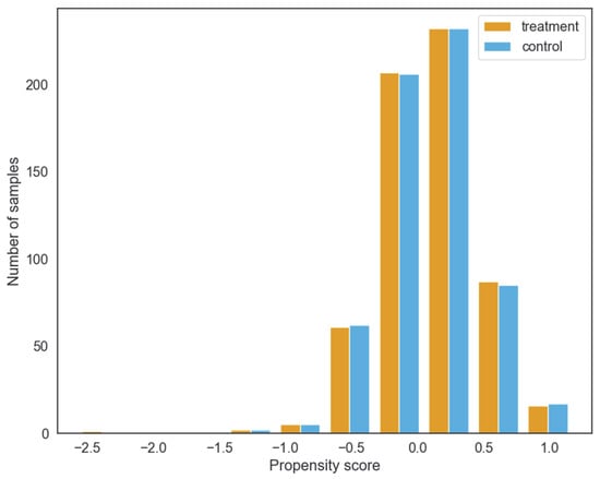 Since the treatment and control groups include companies from different industries, there can be some differences in the characteristics of the companies in the two groups, and these differences may affect the estimation results. In addition, the trends in the two groups may be different in the DID estimate before the implementation of GCP. Therefore, the preconditions for using the propensity score matching method are that the common support test and the balance test are satisfied to ensure that the matching effects of the samples meet the requirements. We carry out matching using the psmpy package developed by Kline and Luo [52]. In this paper, the nearest neighbors algorithm with matching with replacement is used; the caliper size is set to 0.05, and matching is performed based on the propensity score. The result of the common support test is shown in Figure 3. The propensity score distributions of the vast majority of samples in the treatment and control groups are very similar after matching, and the matching accuracy is guaranteed. It is necessary to point out that we set the caliper value based on the nearest neighbor matching (NNM) method, which effectively solves the problem that the method of NNM has difficulty guaranteeing the matching quality when the distribution of propensity scores between the treatment group and the control group is widely different. Furthermore, although the number of samples in the control group is decreased by using matching with replacement, the bias reduction improves the fitting ability of the algorithm and the overall matching quality [24,53].