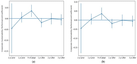 The test results are shown in Figure 5. Before the implementation of the policy, Figure 5a,b show that the confidence intervals for the interaction terms from 2010–2011 both contain 0, meaning that the original hypothesis is accepted and the coefficient of the interaction term is not significant. Therefore, there is a parallel trend between the treatment and control groups after matching. The Green Credit Guidelines policy was formally implemented in 2012, and both Figure 5a,b show that the confidence interval of the interaction term does not contain 0 and the coefficient is significant. In addition, the confidence intervals for the years 2013 to 2015 interaction terms do contain 0 and the coefficients are insignificant. These findings indicate that there is no long-term effect of GCP on the sustainability performance of HPEs, with the effect of policy implementation diminishing over time. The main reason for this is that China’s green financial reform started late and did not have a complete package of measures in place when implementing the Green Credit Policy (GCP). In addition, despite the Chinese government’s efforts to create a favorable business environment, corruption occurs due to the high level of government–business nexus as a result of China’s special political system and inadequate media oversight. Local officials conspire with corporate managers to exempt companies from environmental penalties, or fail to disclose environmental information in the pursuit of political achievements [50]. Enterprises fraudulently obtain green credit resources from banks through ‘greenwashing’ behaviors. GCP may be implemented in a biased manner, reducing policy effect. The implementation of GCP has a negative impact on the financial performance of commercial banks, which may reduce the criteria for granting green credit. Furthermore, green credit policy (GCP) not only strengthens corporate financial constraints, but also reduces investment efficiency and the scale of debt financing, causing policy performance to be offset by corporate losses, resulting in insignificant long-term policy effects [55,56].