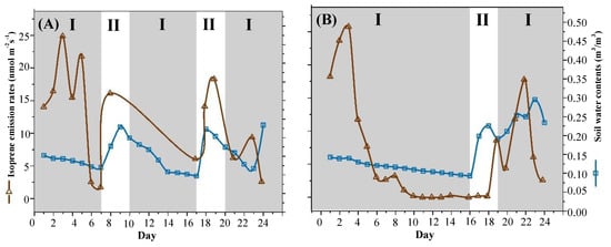 SWC and isoprene emission rates in drought–rehydration cycles of different drought durations. (A). SWC and isoprene emission rates in a drought-rehydration cycle of short drought duration. (B). SWC and isoprene emission rates in a drought-rehydration cycle of long drought duration. ‘I’ represents the drought period; “II” represents the rehydration period. (Note, The Fiso data of short drought durations in D9-D15, and D20 was lost).
