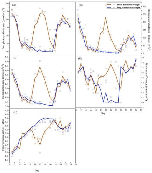 The changes in net photosynthetic rate, stomatal conductance, transpiration rate, water use efficiency, and vapor pressure deficit during short and long durations of drought rehydration cycles. (A). The changes in net photosynthetic rate in short and long durations of drought rehydration cycles. (B). The changes in stomatal conductance in short and long durations of drought rehydration cycles. (C). Changes in transpiration rate in short and long durations of drought rehydration cycles. (D). Changes in water use efficiency in short and long durations of drought rehydration cycles. (E). The changes in vapor pressure deficit in short and long durations of drought rehydration cycles.