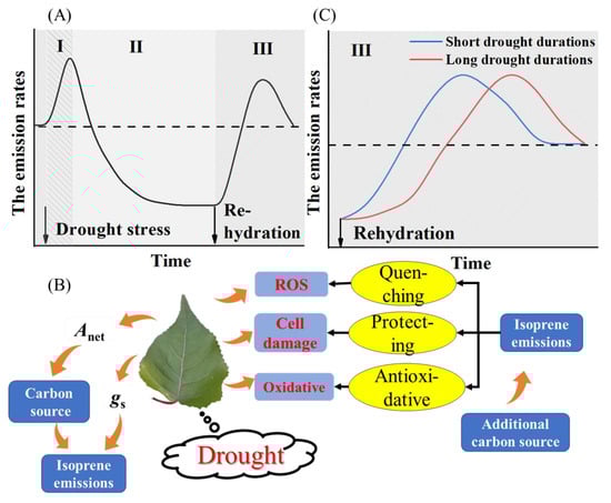 Based on our results and a review of previous research on the leaf-level response of isoprene emissions to the drought-rehydration cycle, we hypothesize that the response has three phases (Figure 4). The drought-rehydration cycle is divided into phases I, II and III. Figure 4A shows the changes in BVOC emissions in phases I, II and III of the drought rewatering cycle. Figure 4B shows that in phase I, the stimulation of BVOCs by drought stress is the focal point of the debate. Figure 4C shows the effect of short and long drought durations on the recovery rate of BVOCs in phase III. In phase I of mild drought stress, emissions were stimulated using alternative carbon sources and used to protect plants against the stress, even though reduced values of stomatal conductance were associated with the physiological response to drought stress (Figure 4A,B). In phase II of more severe drought stress, emissions were suppressed by reductions in substrate availability and/or isoprene synthase transcription (Figure 4A). In the III phase of rehydration, emissions recovered fully (Figure 4A), but the recovery rate of emissions under long-duration drought conditions was slower than the recovery rate of emissions under short-duration drought conditions (Figure 4C). The hypothesis for phase I of Figure 4A is based on the observation that drought stress enhances BVOC emissions (Table 1). The second part of the hypothesis (Figure 4B) is based on numerous observations [,,,,,,,,,], while the last part of the hypothesis (Figure 4C) is based on observations and theoretical considerations [].