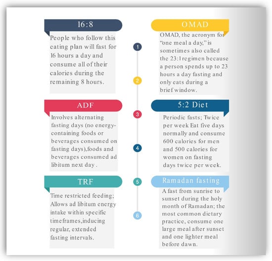IF has been a popular health trend in recent years. The most prevalent approaches to this type of eating pattern are illustrated in Figure 1. The 16:8 strategy comprises fasting for approximately 16 h per day and eating during an 8 h window. The OMAD (One Meal a Day) is one of the extreme intermittent fasting methods. OMAD requires fasting for roughly 23 h a day and a short eating window of 1 h. Alternate-day fasting entails abstaining from food for approximately every other day, either by abstaining entirely or by ingesting only a few hundred calories. According to the 5:2 diet, one must eat regularly for five days out of the week while substantially reducing caloric consumption on the other two days of the week. Time-restricted feeding (TRF) is a dietary plan characterized by calorie consumption in a short interval limited to six to ten hours during the active period of the day without sacrificing food quality or quantity. During Ramadan fasting, it is customary to refrain from drinking or consuming any food between the hours of sunrise and dusk. In contrast, zero-calorie liquids such as water, tea, and coffee are often tolerated during other forms of intermittent fasting [,].