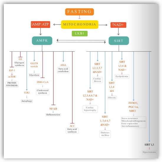 Molecular mechanism of action of fasting. Blue lines—activating action, Red lines—inhibiting action.