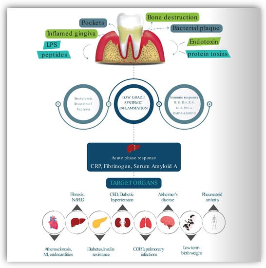 The periodontium responds to the dental plaque by the release of bacterial lipopolysaccharides (endotoxins), chemotactic peptides, protein toxins. These molecules stimulate the host to produce a variety of responses with the production of inflammatory mediators IL-6 IL-1β, IL-6, IL-8, IL-12, TNF-α, MMP-8 & 9, PGE2 and fibrinogen. This type of bacteremia causes the liver to initiate an inflammatory and immunological response, resulting in higher blood levels of c-reactive protein and the production of serum amyloid A and fibrinogen. These and other host products response may influence a variety of essential disease pathways and are capable of initiation and development of chronic systemic diseases in target organs. COPD—Chronic obstructive pulmonary disease, NAFLD—Non-alcoholic fatty liver disease, MI—Myocardial infarction, PGE2- Prostaglandins, MMP—Matrix metalloproteinase, IL—Interleukin, TNF-α—tumor necrosis factor-alpha, CRP—C-reactive protein.