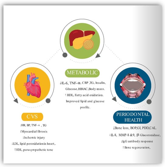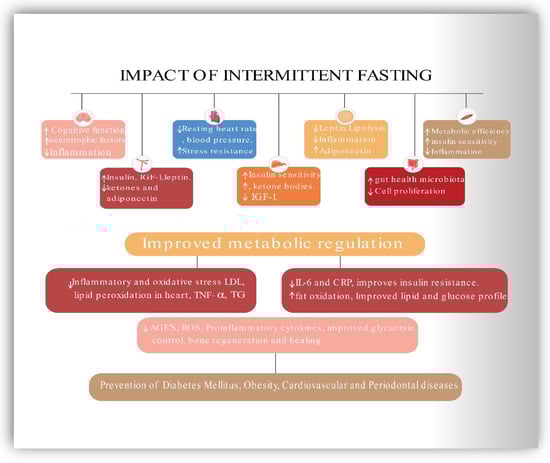 Bodyweight, waist circumference (WS), body mass index (BMI), BP, fasting plasma glucose (FPG), total cholesterol, CRP, and HDL were all reduced as a result of clinically supervised fasting. At the same time, BOP and GCF levels were also reduced as a result of the fasting []. As a result, fasting may be recommended as an additional strategy in addition to routine periodontal therapy in obese and overweight individuals who have been diagnosed with periodontitis. Therefore, it will be imperative to conduct many randomized clinical trials in persons who have MetS and periodontal disease in the future. Figure 3 presents a schematic representation of the impact of IF on CVS, metabolic, and the periodontal health