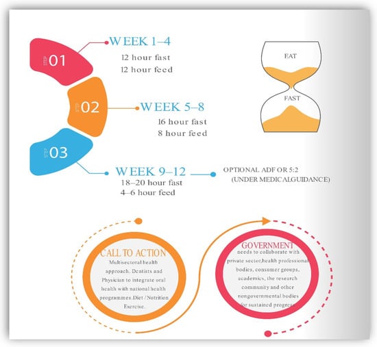 We suggest widespread adoption of IF can be vital in the medical, dental, and nutrition communities to improve human health, particularly in connection with excessive eating habits and a sedentary lifestyle. Facilities that support patients in the transition to sustainable IF programs and routines are crucial, which include food, nutrition, exercises, and psychological assistance. It is essential to understand the social determinants like ever flashing commercial advertisements of fast food, dietary globalization, and decreased general physical activity as current barriers. Changing present trends will necessitate a diversified approach. Additionally, individuals who begin an intermittent fasting diet may feel initial discomfort, hunger, and irritability; however, these symptoms often decrease after a few weeks []. As a result, it is preferable to begin gradually. For instance, physicians may counsel patients to restrict their consumption to 12 h each day. Once patients become accustomed to this eating pattern, the feeding window may be reduced to 8 h as this provides the patient with daily calorie flexibility, which improves compliance. After becoming accustomed to eating on a scheduled plan of IF, patients may move to fast on an alternate day or periodic fasting under the guidance of a professional nutritionist. A multisectoral approach is needed to halt the escalation of MetS epidemics. An ounce of prevention is worth a pound of cure. Fasting procedures that are well-structured and tailored can help lower the risk of metabolic disorders. Figure 6 presents the suggested integrated approach to adapting IF as a preventive interventional strategy.