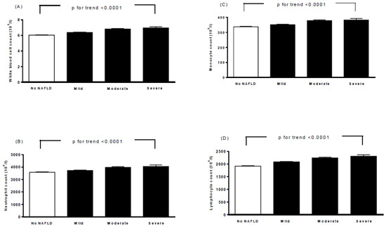 Associations between white blood cell count (A), neutrophil count (B), monocyte count (C), lymphocyte count (D), and severity of nonalcoholic fatty liver disease. Bars represent the mean ± SD. A generalized linear model was used to test the trend of each continuous variable across four study groups.