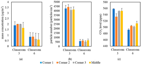 Spatial variability in classrooms 3 and 6 based on (a) PM, (b) PN, and (c) CO2. The error bars indicate standard deviations of values measured in a single day.