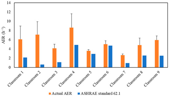 Air exchange rate (AER) values for the tested classrooms. The error bars indicate standard deviations of the values measured on three different days.