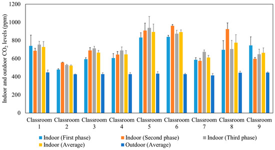 Average outdoor and indoor CO2 levels during the three phases in the studied classrooms. The error bars indicate standard deviations of values measured in a single day.