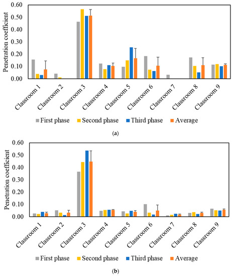 The indoor particle penetration (P) was calculated based on the steady-state approach, which is similar to that of Chao et al. (2003) [48]. Treating the classroom as a closed system allows for the application of the mass balance equation. Equation (1) illustrates the mass balance applied in the tested classrooms: