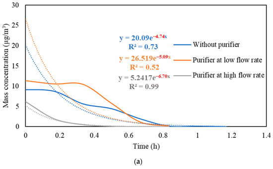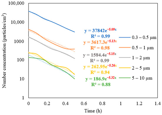 The decay in the particle mass and number concentrations was plotted as a function of time after switching off the aerosol source. Decay curves were obtained for a range of particle sizes (0.3–10 µm) to estimate the purifier’s efficiency in removing different particle sizes. In addition, the purifier removal efficiency for ultrafine particles was estimated using PN data obtained from the DiSCmini since it mainly detected particles with diameters below 0.3 µm.
