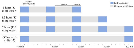 In the case of the University of the Basque Country [46], a series of ventilation guidelines were given depending on the type of space. Figure 1 shows the protocol used for classrooms and administration spaces. It was established that minimum continuous ventilation periods of 10 min had to be guaranteed and that all windows and access doors be opened in certain intervals. The scheme was proposed for classes of 50, 80 and 110 min, with at least 10 min of continuous ventilation in every half-hour segment.