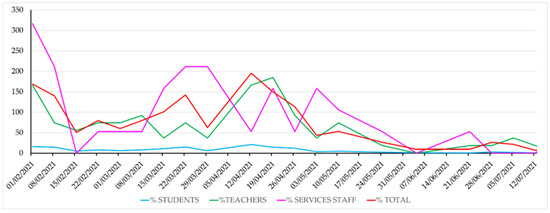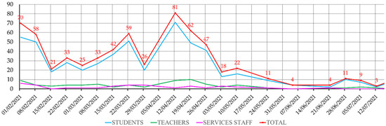 Students were logically the most affected group in absolute case number, as they were the most numerous (about 34,000). However, in Figure 3, the virus’s incidence relative to the size of each of the different groups can be seen. Relatively, the most affected were teachers and administrative staff, but this probably has to do with the fact that students did not report the disease to the university’s administration that kept the record, and only their professors were informed that they could not attend classes with mandatory attendance.