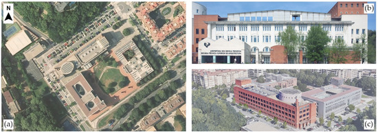 Location of the case study. (a) Aerial view. Source: Geoeuskadi. (b) Front façade (south), where A 1.1 is located. Source: UPV-EHU. (c) Perspective of the north façade oriented to the parking lot. Note that A 2.1 and the Administration space studied are located in this façade. Source: Google Maps.