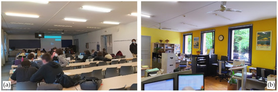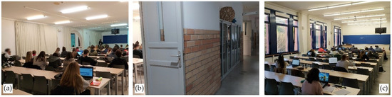 The characteristics of the described spaces are summarised in Table 1, while Figure 8 provides an idea of them in actual use. Note that despite the fact that the ventilation protocol establishes the aforementioned ventilation schedule, the image shows classroom A 1.1 with full ventilation not only during breaks, but also during lessons. It is also worth mentioning how mandatory mask usage was a measure with very high compliance during lessons, but interpersonal distancing requirements are not met due to the need for groupwork in lessons, despite existing markings on tables to prevent the use of every other seat.
