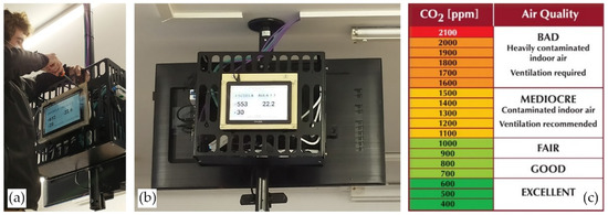 For occupants to be able to interpret the data the display was showing them, a legend sticker was placed next to each door and light switch, which was also distributed in a leaflet at the beginning of the 2020–2021 school year. This particular CO2 concentration scale is commonly used and was deemed appropriate for this pilot experience in this school as it provided a simple yet fairly detailed classification of CO2 levels and is worded in a way that was believed would trigger action by the users. In addition, it has some markings comparing to the regulatory values set forth in RITE [28], which was expected to provoke the occupants to perform some ventilation before reaching the standard’s limit (e.g., users would act when 700 ppm was reached to continue to be on the “Excellent” mark of the chart instead of waiting to surpass the 900 ppm limit for IDA 2).