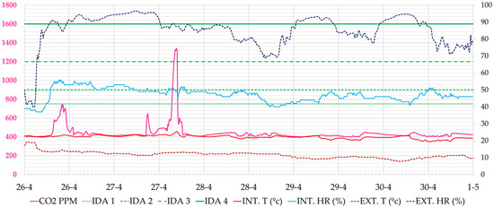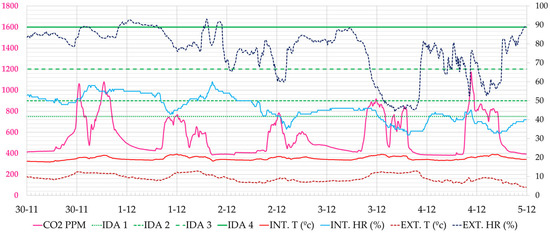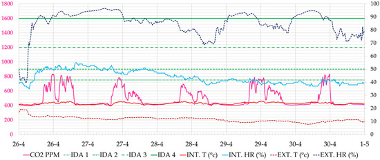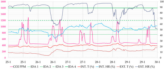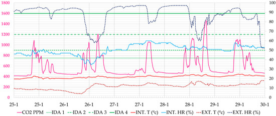 In a study in the Basque Country carried out in six schools in the Bajo Nervión (Bilbao) [34] with different outdoor air qualities, all of the studied classrooms exceeded the limit set by the standards of 800 ppm of CO2.