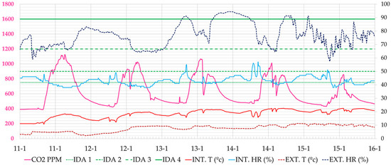 In Phase II, students and teachers were informed that the new displays installed were intended to show real-time CO2 levels. A scale of values were explained at which students or teachers should perform more intensive ventilation of the classrooms. Legends with acceptable CO2 levels were placed at various points in the classrooms. In the case of the administration area, the information provided by the sensor’s display itself were uncovered. Students, teachers and administrative staff were informed of the acceptable CO2 levels, and the janitors were informed or reminded of how to proceed with the opening of the windows. During this phase, winter conditions were evaluated and a week in early May with milder weather outside was also analysed.