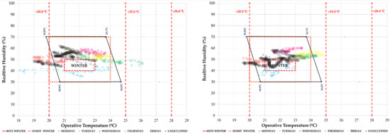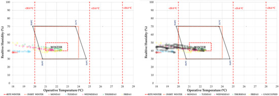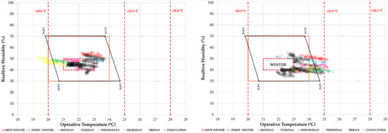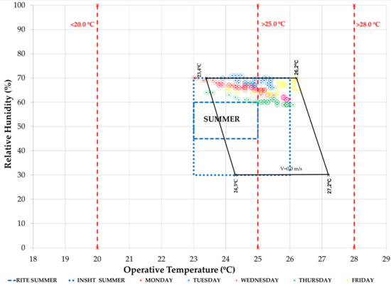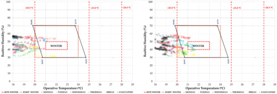 For thermal comfort, ISO 7730 [48] was used because it is implicit in the CTE building code [51]. The limits were obtained for category II of said standard, with a MET index of 1.1 and a CLO index of 1 during winter. For the summer months, the same MET and a CLO of 0.5 was used, typical for summer indoor clothing. In addition, the thermal comfort limitations established in RITE [28] were observed. This regulation sets the acceptable interval of temperatures for offices in summer at 23–25 °C and the interval for winter at 21–23 °C; relative humidity intervals are set at 45–65% and 40–50% for summer and winter, respectively. In addition, the National Institute of Occupational Safety and Health (INSST) [52] establishes the acceptable range of temperatures in offices with the aim of guaranteeing a percentage of dissatisfaction lower than 10% of 23–26 °C (summer) and 20–24 °C (winter) and a whole year relative humidity acceptance interval of 30–70%.