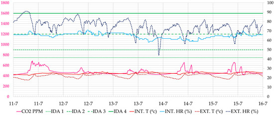 The data collected were analysed in two ways. First, we analyse the evolution of CO2 concentration in the spaces studied throughout the week, during the occupied hours. These data will be used to evaluate the air quality situation with respect to the Spanish RITE [28] regulation. Second, hygrothermal comfort has been analysed according to the international standard ISO 7730:2005 [48].