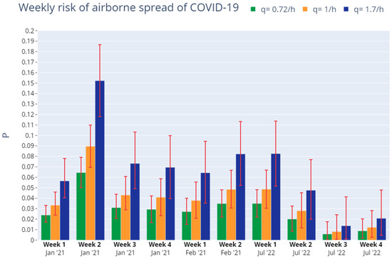 Figure 27 shows the same results in graphical form. As can be seen, there was no significant reduction in airborne spread risk between Phase I and Phase II except in the case of the second week of January 2021. Also, the analysis for the beginning of July 2022 (Phase III) shows similar risk as Phases I and II. However, a significant decline in airborne spread probability happens in the second to last weeks of July 2022.