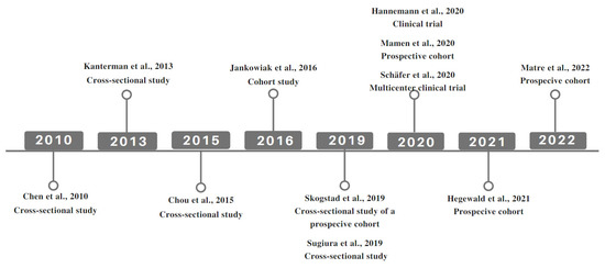 Timeline of publications and study types of articles included in this systematic review [21,23,24,25,26,27,28,29,30,31,32].