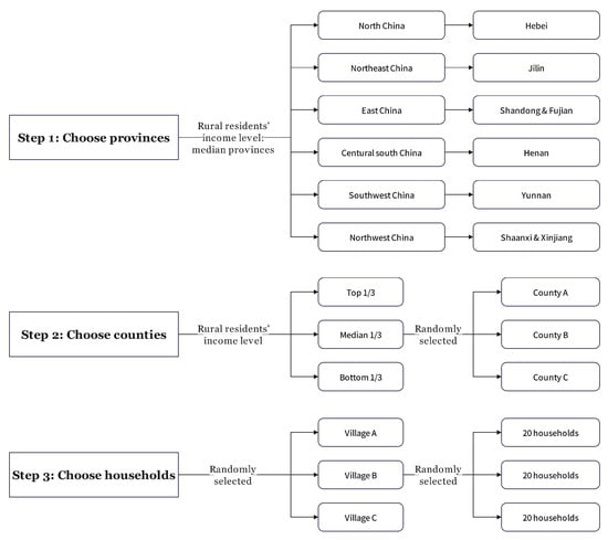 In this study, we used data from the 2012–2018 Survey for Agriculture and Village Economy (SAVE) data by the Institute of Agricultural Economics and Development (IAED), Chinese Academy of Agricultural Sciences (CAAS). The dataset included 16,613 rural households from eight provinces (Hebei, Jilin, Fujian, Shandong, Henan, Yunnan, Shaanxi, and Xinjiang), 30 counties, and 295 villages (Figure 1). The data recorded the food consumption and food expenditure of the sampled households over a whole year [51,52].